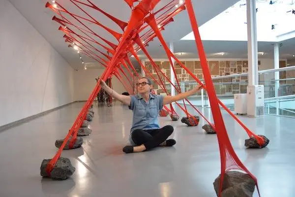 Al mudarse a Montreal, la artista creó Tensión, una instalación con medias rojas que conecta el cuerpo con el entorno. Esta obra refleja su transición de sentirse vulnerable como mujer a sentirse expuesta bajo su condición de inmigrante.