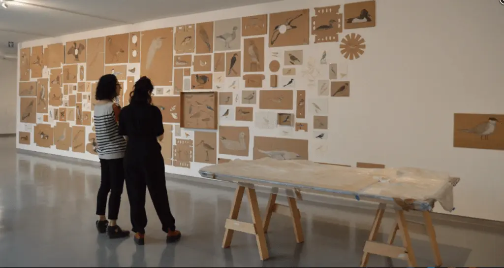 Esta pieza dialoga con Migrantes neotropicales, una serie de 154 dibujos de aves realizados sobre cartones reciclados que viajan. La obra resalta la resiliencia y vulnerabilidad de las poblaciones que cruzan fronteras constantemente.
