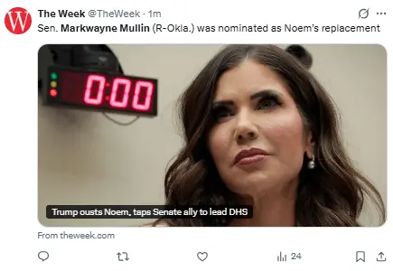Regeneración, 6 de febrero 2026 – Donald Trump dio a conocer el jueves que destituía a Kristi Noem de su cargo como secretaria del Departamento de Seguridad Nacional, y que el senador republicano Markwayne Mullin, de Oklahoma, asumiría su puesto.