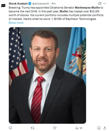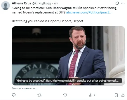 Mullin, quien ha sido senador desde 2023, es un exluchador de artes marciales mixtas y un firme defensor de la dura política de inmigración de Trump.