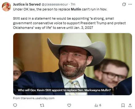Mullin no tiene la capacidad de hacer eso ya que es senador en este momento.
