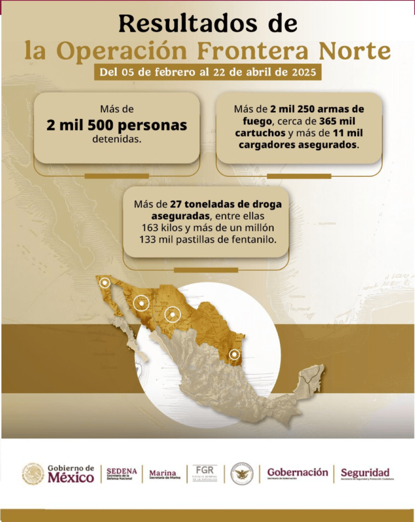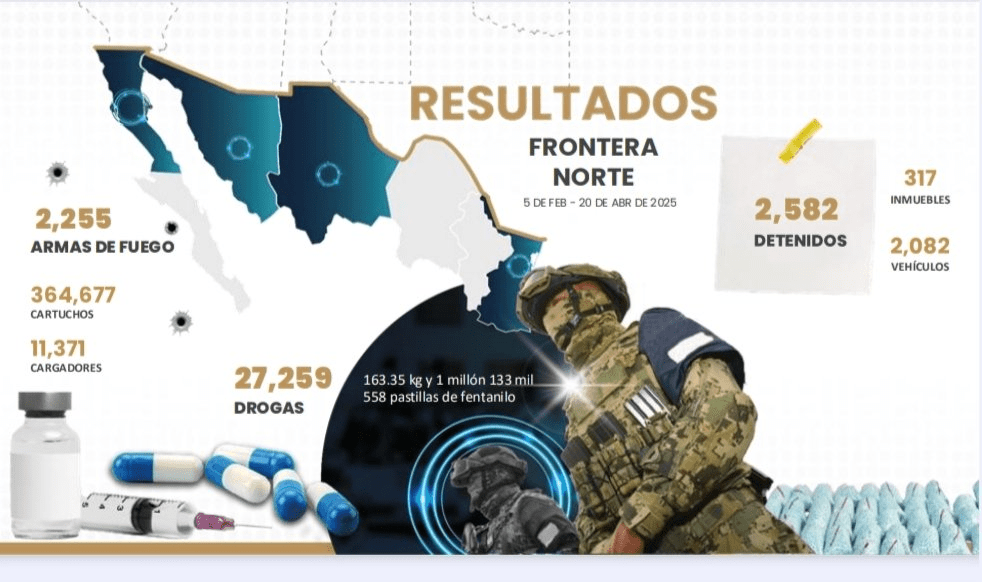 Como lo instruyó la Presidenta de México, desde el 5 de febrero, se implementó la Operación Frontera Norte, que ha dado los siguientes resultados a la fecha: