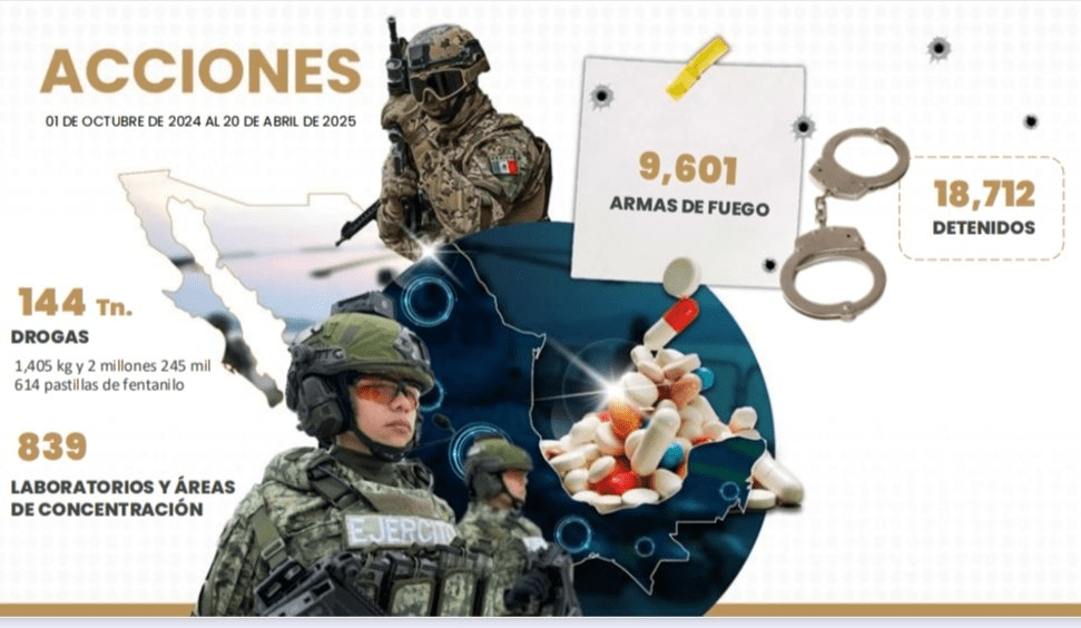 Desde el inicio de esta administración en octubre de 2024, las autoridades han incautado 1.5 de toneladas y 2.2 millones de pastillas de fentanilo; 58.1 toneladas de metanfetaminas, 41 de cocaína y 42 de marihuana.