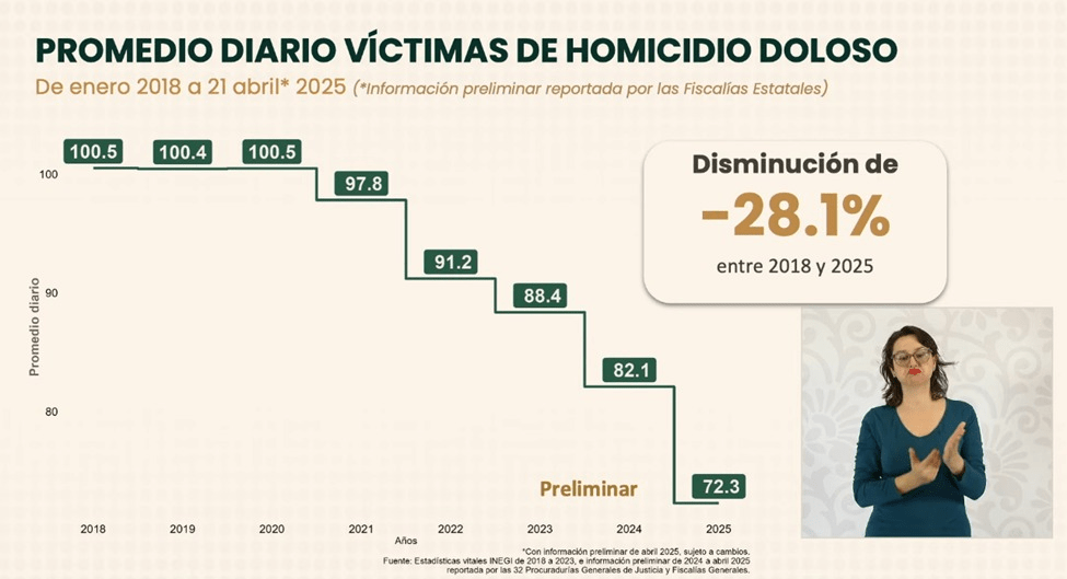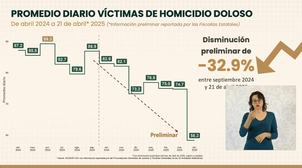La reducción preliminar de homicidios es de 32.9 por ciento, de acuerdo con el promedio diario de víctimas en el periodo que corre entre septiembre de 2024 y el 21 de abril de 2025.