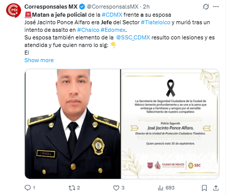 Regeneración, 1 de octubre 2025– La Secretaría de Seguridad Ciudadana (SSC) de la Ciudad de México confirmó la muerte de José Jacinto Ponce Alfaro, jefe del Sector Tlatelolco, quien perdió la vida durante un intento de asalto en el municipio de Chalco, Estado de México.