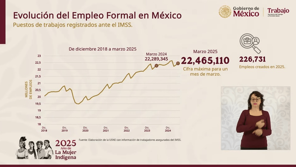 Además, el mes de noviembre del año 2024, el mes con más empleos registrados en la historia del cual se lleva registro, esto fue 22 millones 643 mil puestos de trabajo.