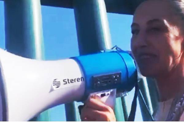 Regeneración, 14 de julio de 2025. Como en los tiempos de juventud cuando defendió la educación pública la presidenta Sheinbaum megáfono en mano reiteró su compromiso democrático en Ensenada, Baja California.