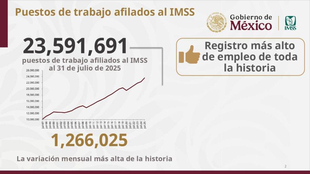 Además en el contexto de las Mañaneras del Pueblo desde Palacio Nacional se informó del registro más alto de empleo de toda la historia con 23 millones 591 mil 691 puestos de trabajo afiliados al IMSS.