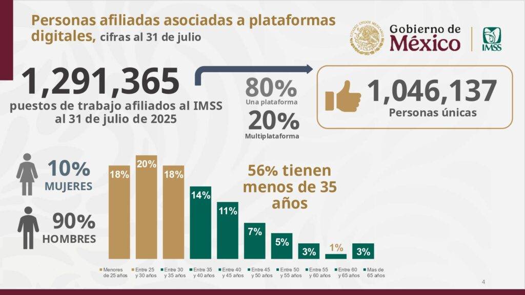 Fuentes gubernamentales subrayan que el director del IMSS, Zoé Robledo, detalló que de los trabajadores de aplicación ahora con seguridad social, el 90 por ciento son hombres.