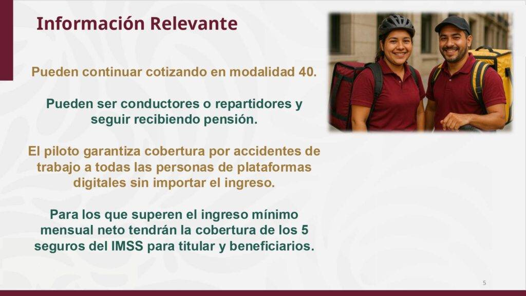 Además, dijo, quienes sean pensionados y sean conductores o repartidores, podrán seguir recibiendo su pensión y también se podrá continuar cotizando en Modalidad 40 del IMSS.