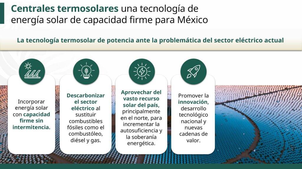 Cuyo uso es inédito en México para concentrar la energía solar en tanques de almacenamiento térmico y con ello producir electricidad incluso en las noches.