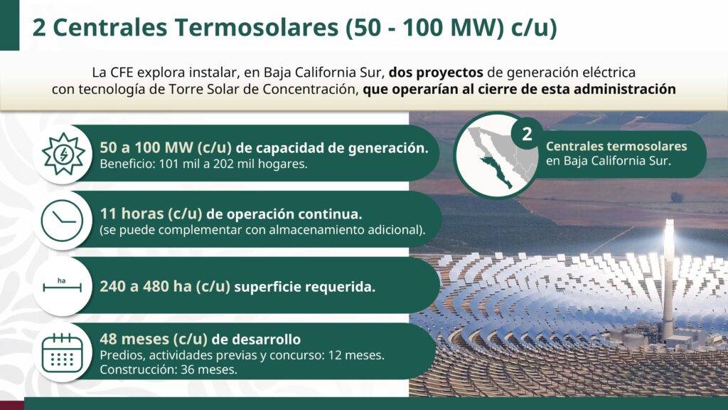 Por otra parte, la secretaria de Energía, Luz Elena González, puntualizó que las dos centrales termosolares en Baja California Sur serán construidas por la CFE.