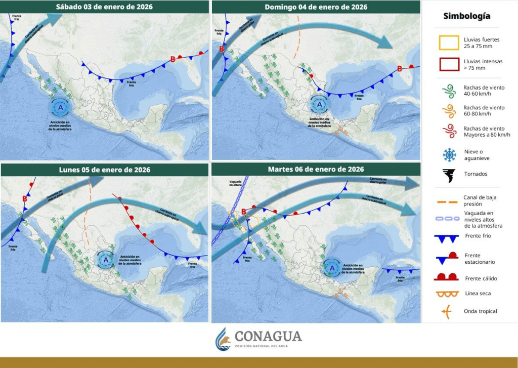 A su vez, se prevé el ingreso de un frente frío sobre el norte y noreste de México, ocasionando un descenso de la temperatura en dichas regiones.