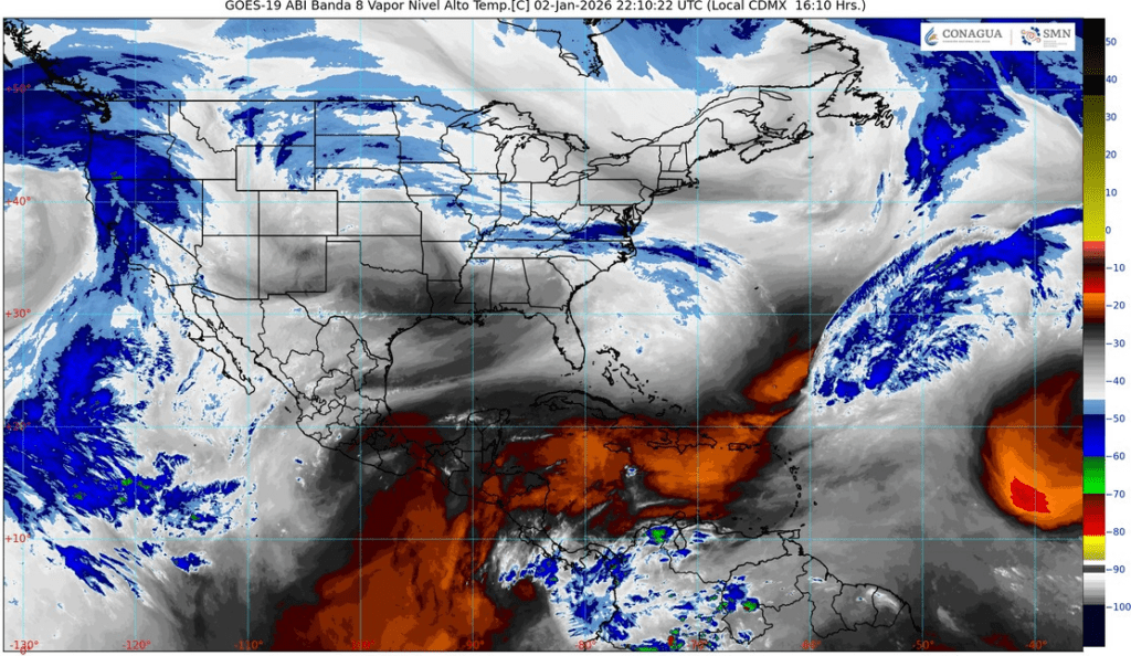 Simultáneamente, un segundo frente frío se aproximará al noroeste de la República Mexicana, se combinará con la corriente en chorro subtropical, originando chubascos en Baja California.