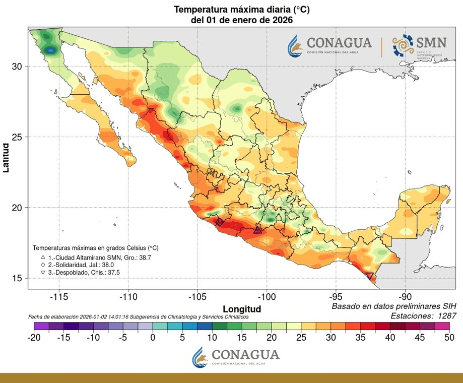 Temperaturas máximas de 35 a 40 °C: Jalisco (costa), Colima, Michoacán, Guerrero y Oaxaca.
