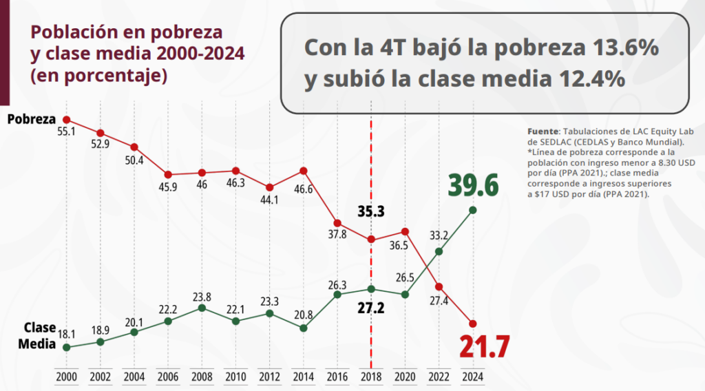 «Y aquí 12 millones de mexicanos, de 2018 a 2024, pasaron a formar parte de la clase media», reveló.