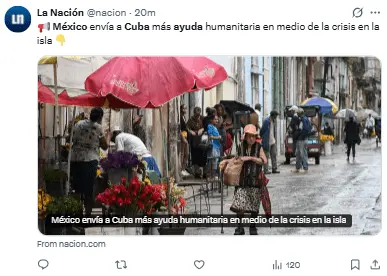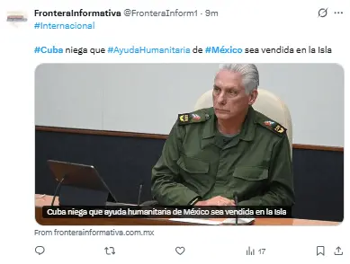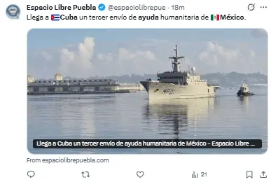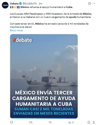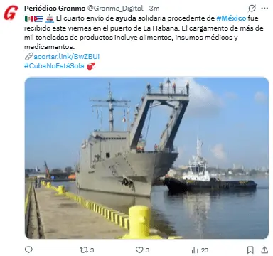 «Están llegando al puerto de La Habana dos barcos con el tercer envío de ayuda del gobierno y del pueblo mexicano para el pueblo de Cuba. Gracias, México, por tu solidaridad con Cuba».