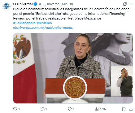 Regeneración, 18 de diciembre de 2025 – México recibió el título de «Emisor del año SSAR» en 2025, otorgado por International Financing Review (IFR) debido a la gestión pública liderada por Édgar Amador Zamora, titular de Hacienda y Crédito Público.