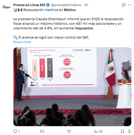 Regeneración, 19 de enero 2026 – México logró una cifra sin precedentes en lo que respecta a la recaudación de impuestos al finalizar 2025, superando los 6 billones de pesos. Esta cifra indica un crecimiento real del 4. 6% en comparación con 2024.
