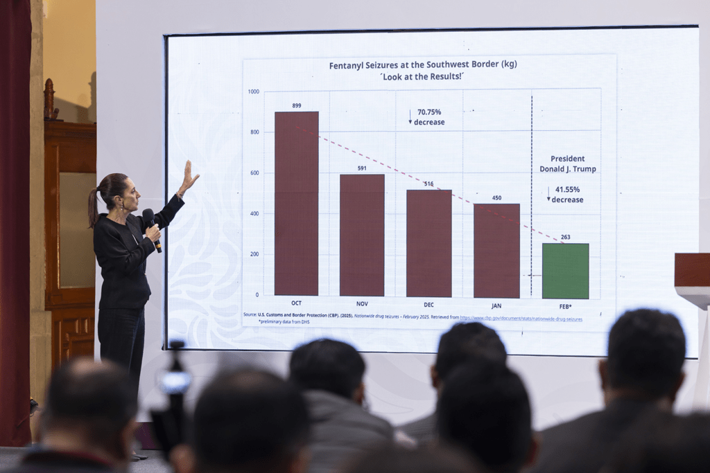 Y es que Sheinbaum explicó que durante la llamada expuso aTrump una gráfica mostrando que particularmente en febrero hubo una reducción de 41.5 % en las incautaciones de fentanilo en la frontera.