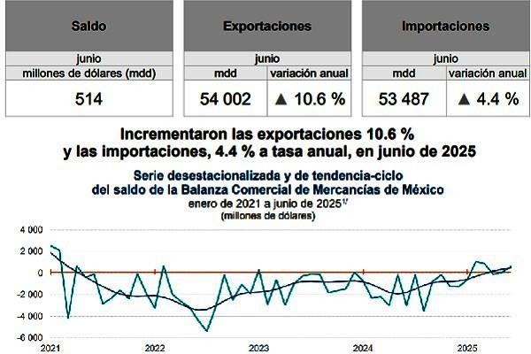 Enero-junio, exportaciones crecen 44% anual, a 312 mil 728 millones de dólares, mejor primer semestre desde 2022 Importaciones +02% anual