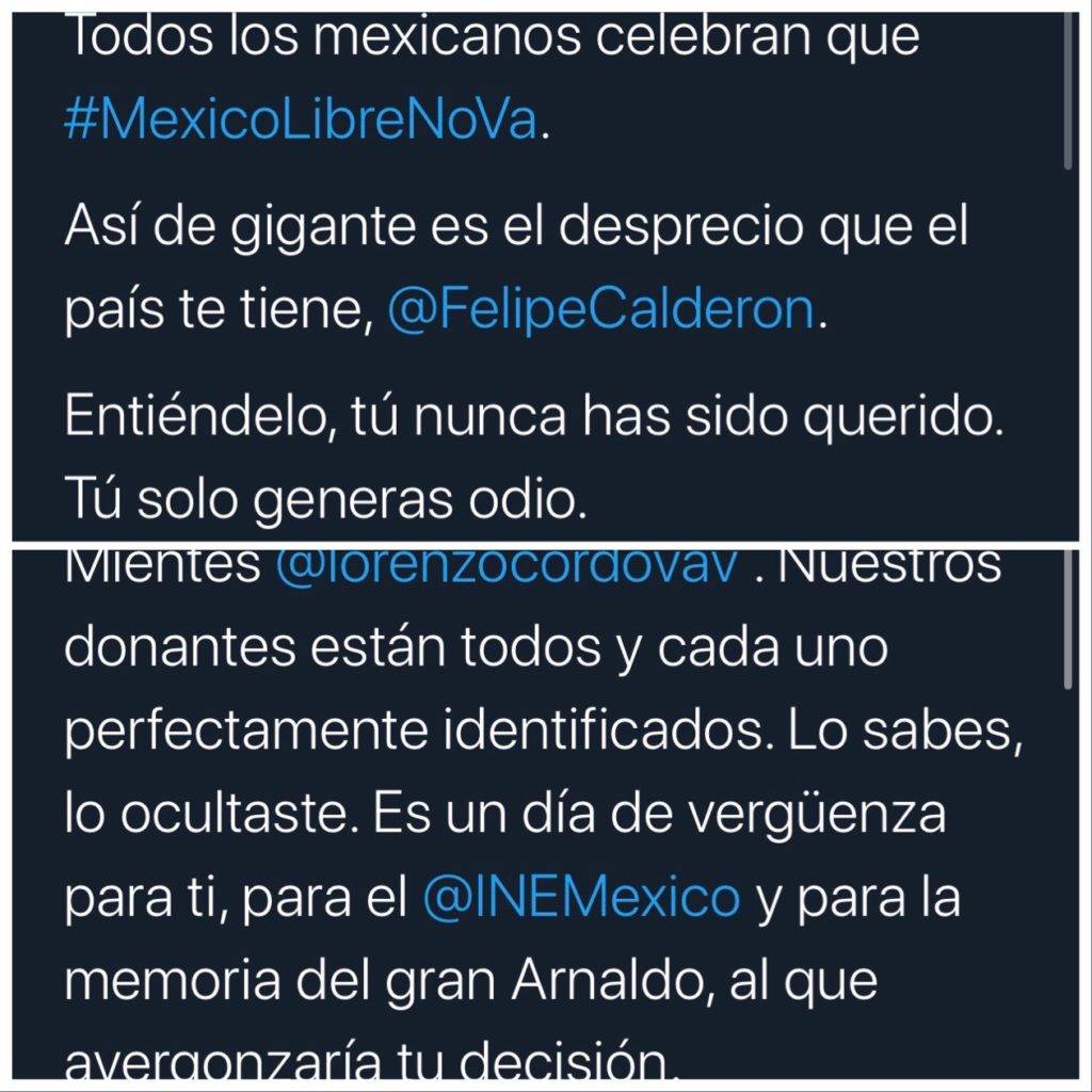 Felipe Calderón escribió en su cuenta de Twitter, «nuestros donantes están todos y cada uno perfectamente identificados. Lo sabes, lo ocultaste. Es un día de vergüenza para ti, para el INE y para la memoria del gran Arnaldo, al que avergonzaría tu decisión».