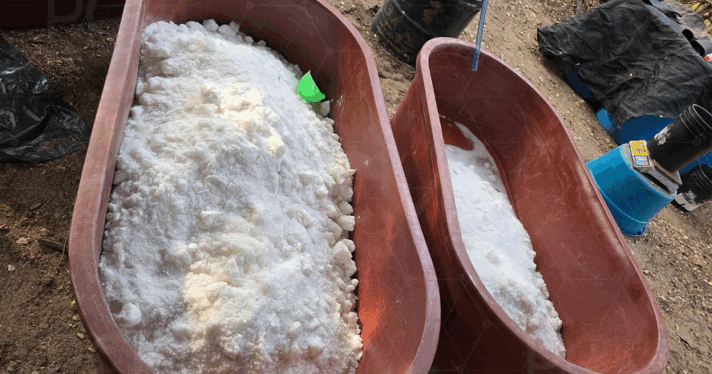Incluso seis cubos con material blanco desconocido, 64 costales con probable sosa cáustica, más de 10 tanques de gas y tres ollas metálicas de gran capacidad.
