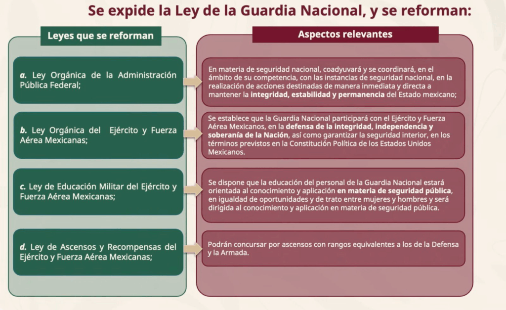 Además dijo que se fortalecerá jurídicamente a través de las reformas a las leyes del Sistema Nacional de Investigación e Inteligencia en Materia de Seguridad Pública; de la Guardia Nacional.