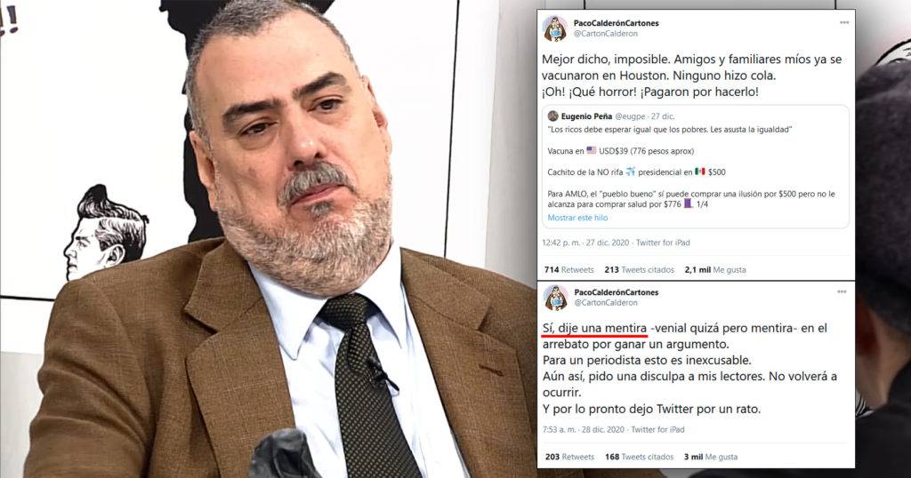 Regeneración, lunes 28 de diciembre, 2020. Antes del «Día de los Inocentes» el caricaturista del Reforma, Paco Calderón, aseguró que su familia había pagado para vacunarse contra el covid-19 en Estados Unidos «sin hacer fila». Luego de que más gente afirmara cosas parecidas, usuarios de redes y periodistas descubrieron que en EU la vacuna no está a la venta. Por Dante García Berlanga, @limpicatto.