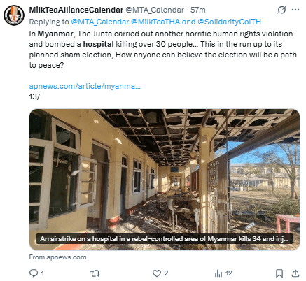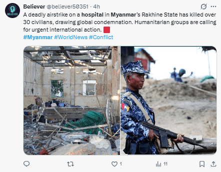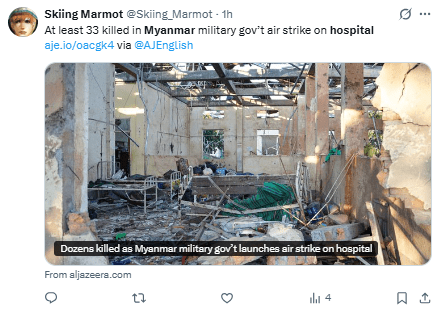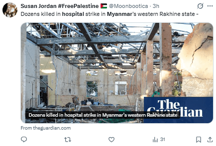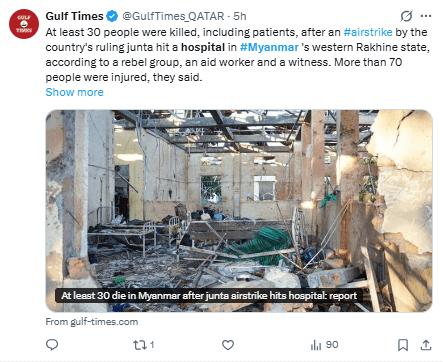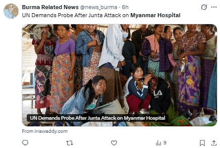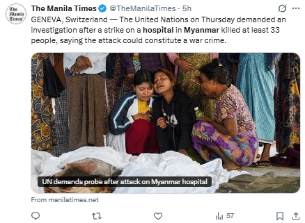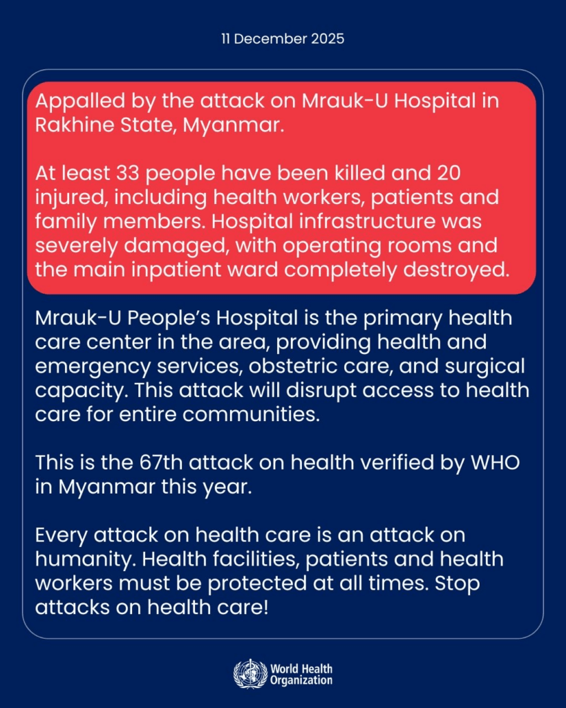 El Dr. Tedros, director de la OMS, publicó un mensaje en X, en el que se expresa que están «consternados por el ataque al Hospital Mrauk-U en el estado de Rakhine, Myanmar.