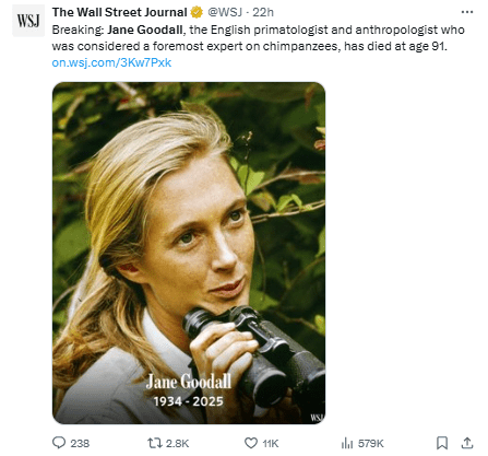 «Los descubrimientos como etóloga de la doctora Goodall revolucionaron la ciencia y fue una incansable defensora de la protección y restauración de nuestro mundo natural», informó el Instituto Jane Goodall.
