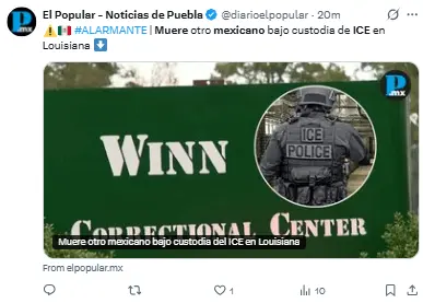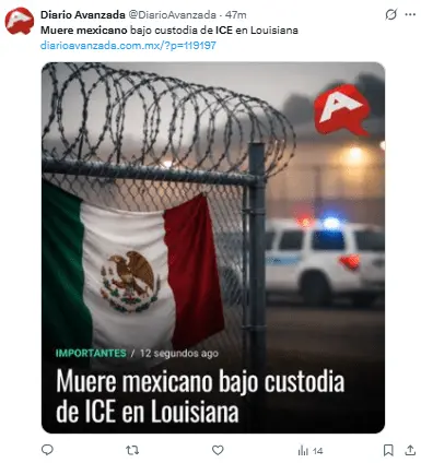 Regeneración, 13 de abril 2026 – Este lunes, autoridades estadounidenses dieron anuncio de la muerte de un migrante mexicano más, que llevaba cuatro meses bajo la custodia del Servicio de Control de Inmigración y Aduanas (ICE).