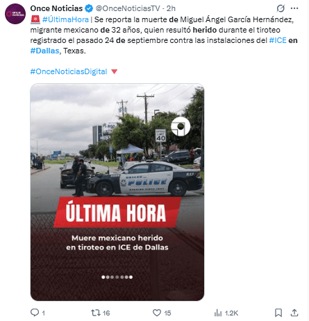 Regeneración, 30 de septiembre 2025– Una segunda víctima del tiroteo perpetrado la semana pasada contra un centro de detención del Servicio de Control de Inmigración y Aduanas (ICE) en la ciudad de Dallas, Texas, murió debido a la gravedad de las heridas sufridas.
