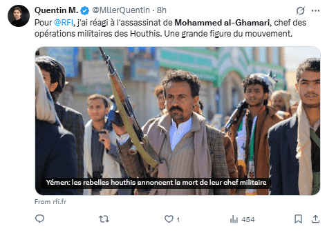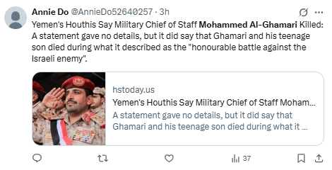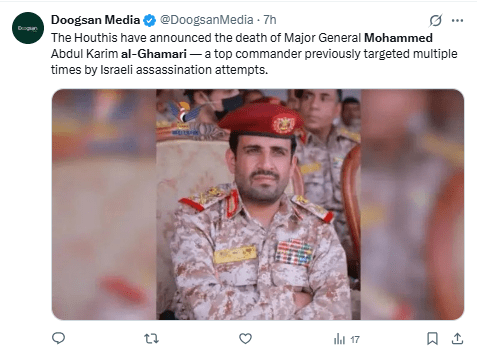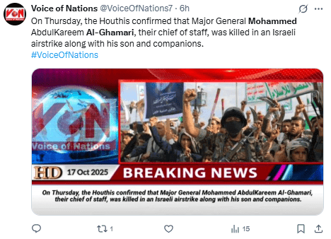 Regeneración, 17 de octubre 2025– El movimiento Hutí de Yemen dice que su jefe de estado mayor militar, Mohammed al-Ghamari, ha sido asesinado. Israel dijo que murió a causa de sus heridas tras un ataque israelí en Saná.