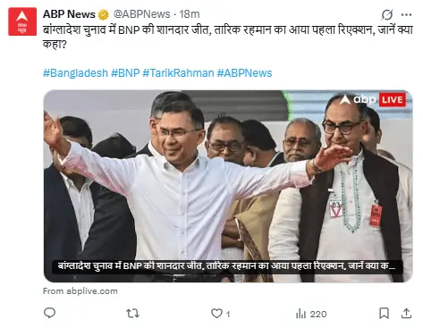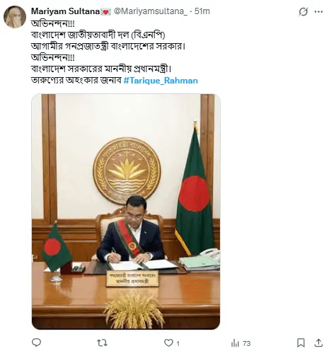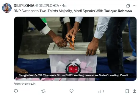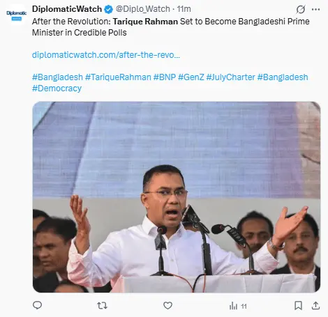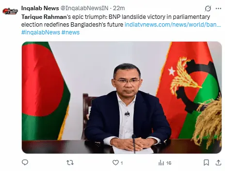 “Extiendo mis más sinceras congratulaciones al Sr. Tarique Rahman por guiar al BNP hacia una victoria contundente en las elecciones parlamentarias de Bangladesh.