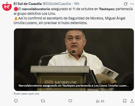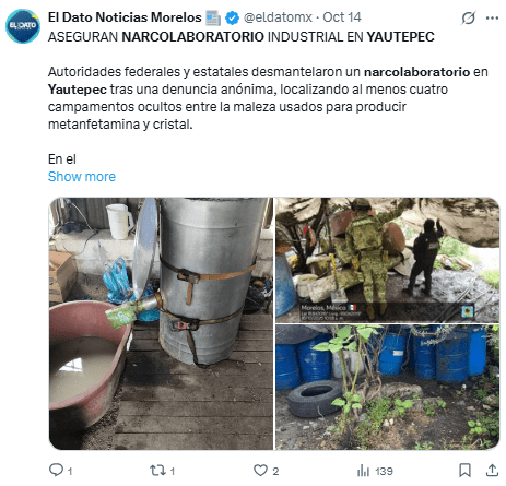 Regeneración, 15 de octubre 2025– El titular de la Secretaría de Seguridad y Protección Ciudadana (SSPC), Miguel Ángel Urrutia Lozano, confirmó que el narcolaboratorio desmantelado en el municipio de Yautepec, pertenece al grupo delictivo denominado “Los Linos”.