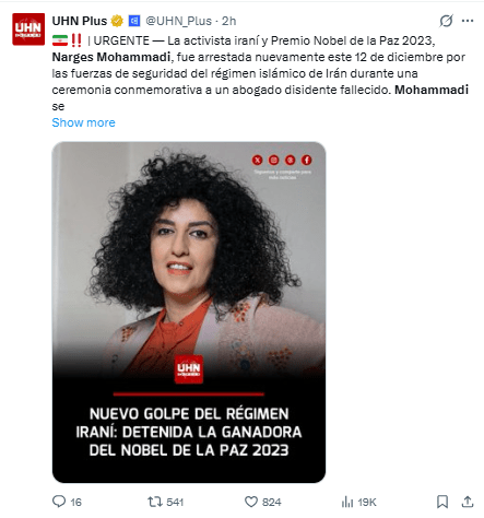 Regeneración, 12 de diciembre 2025– Las Fuerzas de Seguridad de Iran arrestaron este viernes de forma “violenta” a la ganadora del Premio Nobel de la Paz 2023, Narges Mohammadi, durante la ceremonia en recuerdo de un abogado fallecido, informaron sus simpatizantes.