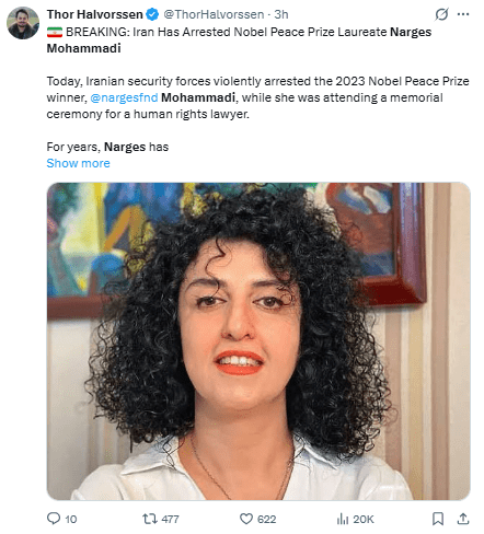 La Fundación Narges ha recibido información creíble de que Narges Mohammadi fue detenida violentamente por fuerzas de seguridad y policiales…