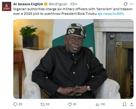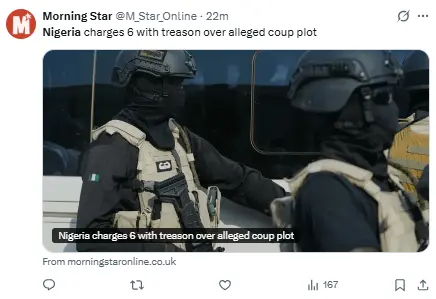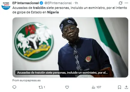 Regeneración, 21 de abril 2026– Seis personas, incluido un general retirado y un inspector de policía en activo, han sido acusados de «terrorismo» y traición por una supuesta conspiración con el objetivo de derrocar al presidente Bola Tinubu, conforme a los documentos presentados en el Tribunal Federal Superior de Abuja.