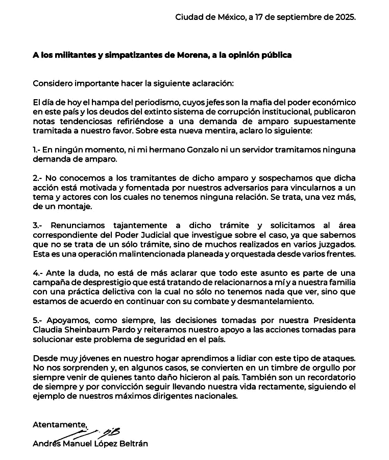 Regeneración, 18 de septiembre de 2025. Los hijos de AMLO se deslindan de amparo promovido en Zacatecas y otras instancias en trámite solicitado por vía electrónica.