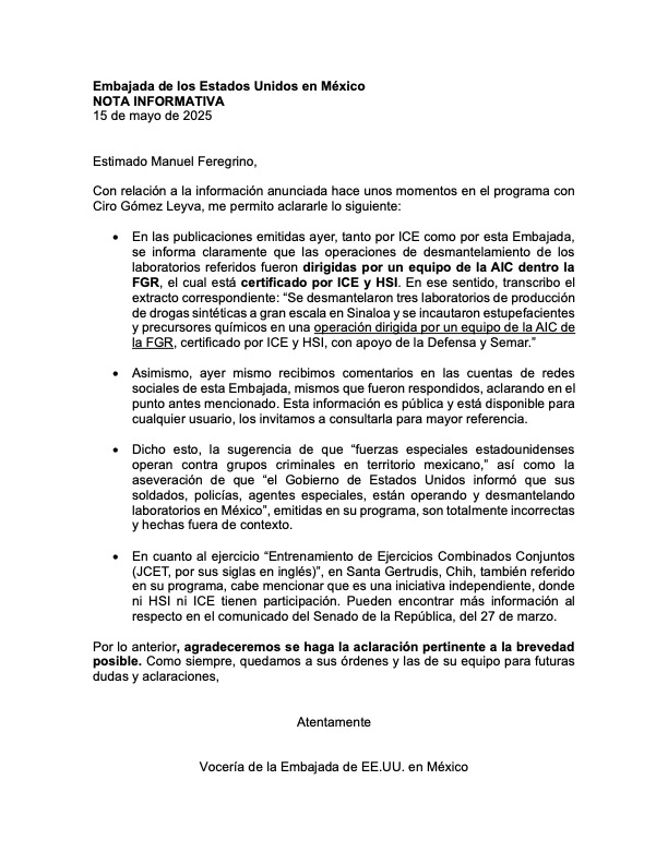 Ante ello, tal como Sheinbaum la embajada estadounidense rechazó la sugerencia de que fuerzas especiales estadounidenses operan contra grupos criminales en territorio mexicano.