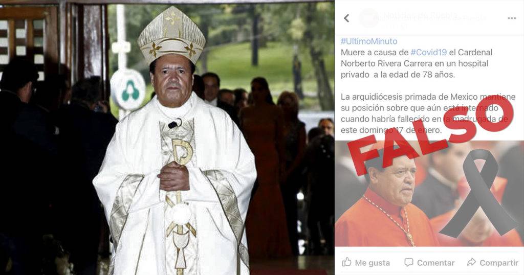 Una publicación en redes sociales afirmaba que la Arquidiócesis Primada de México estaba ocultando la muerte por Covid-19 del cardenal Norberto Rivera