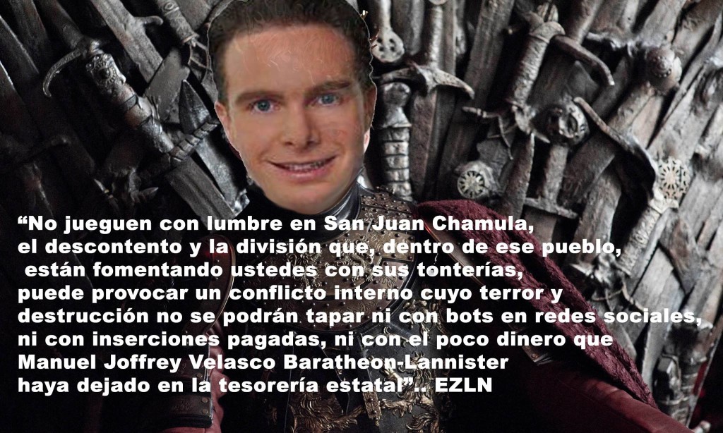 “Y un consejo no pedido: no jueguen con lumbre en San Juan Chamula, el descontento y la división que, dentro de ese pueblo, están fomentando ustedes con sus tonterías, puede provocar un conflicto interno cuyo terror y destrucción no se podrán tapar ni con bots en redes sociales, ni con inserciones pagadas, ni con el poco dinero que Manuel Joffrey Velasco Baratheon-Lannister haya dejado en la tesorería estatal”, expusieron.