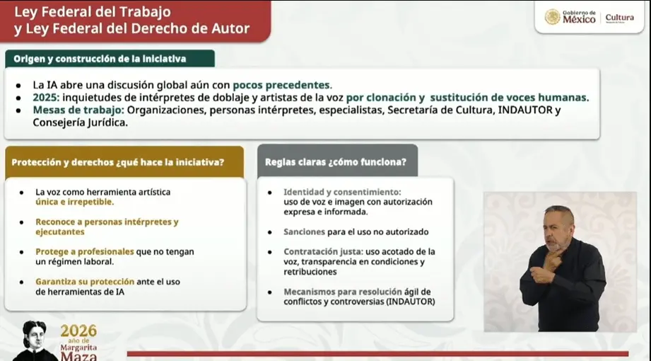 Respecto a la reforma a la Ley Federal del Trabajo y a la Ley Federal de Derecho de Autor, detalló que se reconoce la voz humana como una herramienta artística, única e irrepetible.