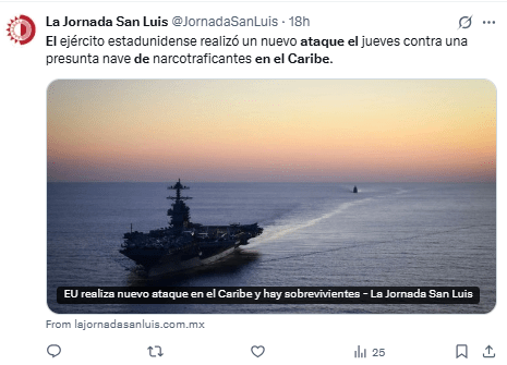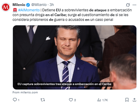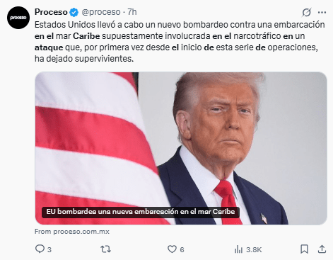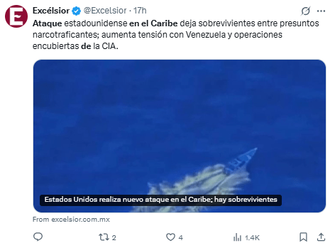 Regeneración, 17 de octubre 2025– Un ataque llevado a cabo por fuerzas estadounidenses contra una embarcación en el mar Caribe dejó varios sobrevivientes el jueves, según reportaron medios norteamericanos.