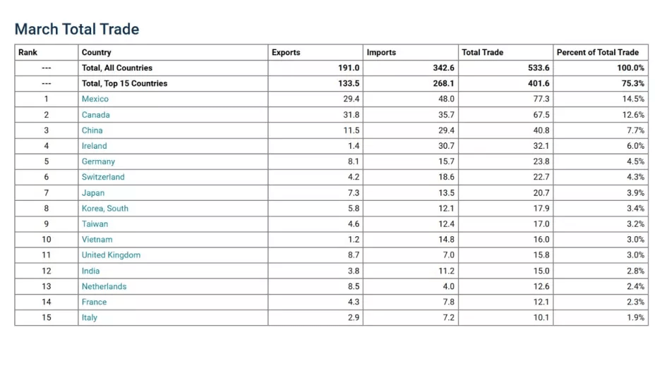 Como se indica, equivalente a 13.3% del comercio total estadounidense; mientras que China se sostuvo en el tercer lugar, con 134 mil 500 millones de dólares, 9.1% del total.