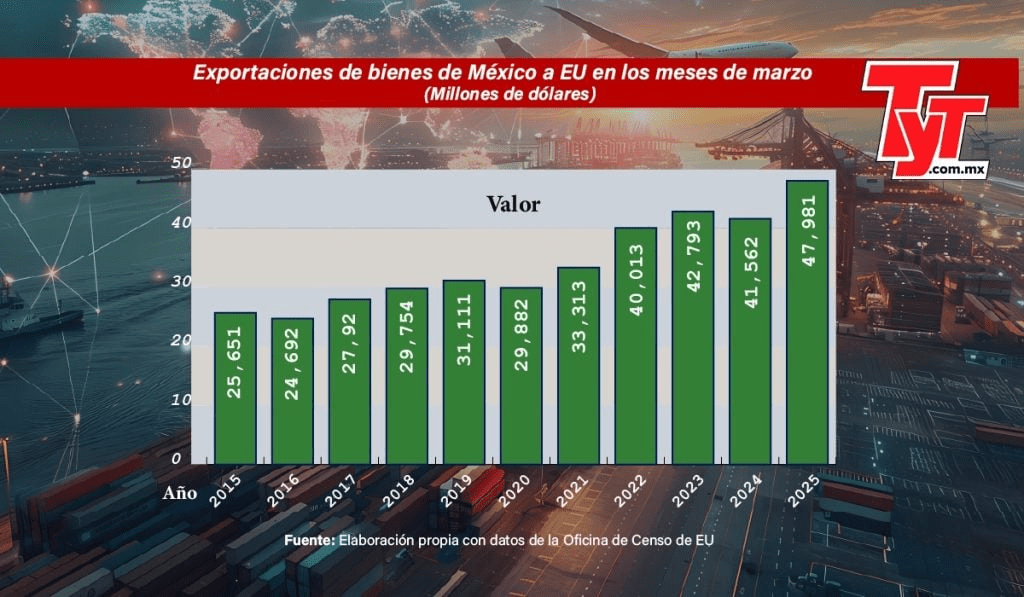 México logró récord en marzo de 2025 al registrar exportaciones de bienes a EE.UU por 47 mil 982 millones de dólares, según datos del U.S. Census Bureau