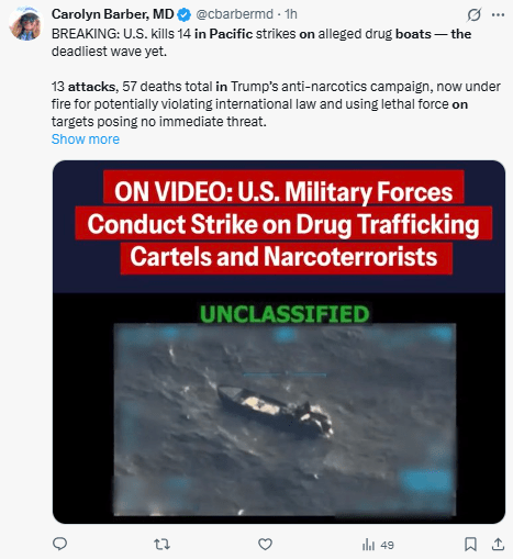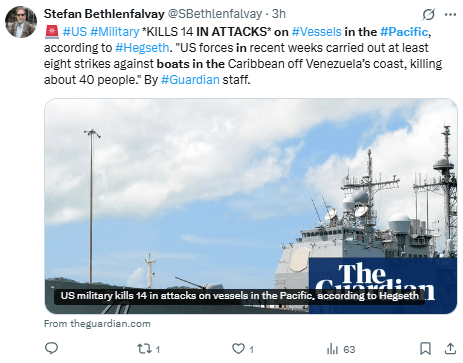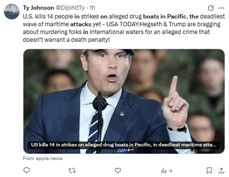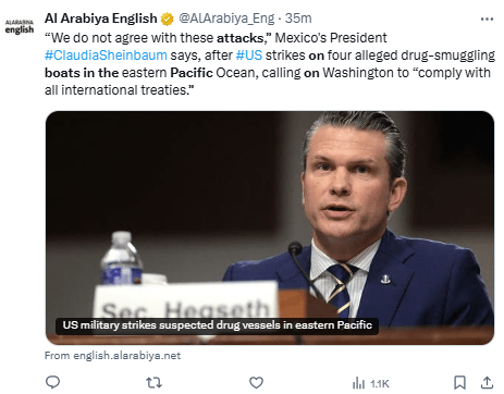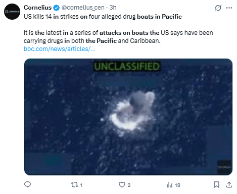Regeneración, 28 de octubre 2025– Las fuerzas estadounidenses mataron a 14 personas en ataques contra cuatro barcos presuntamente cargados de droga en el Pacífico, dijo el secretario de Defensa, Pete Hegseth.