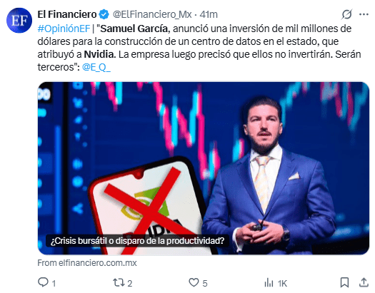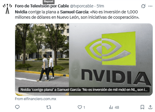 Regeneración, 13 de noviembre 2025– NVIDIA, líder en producción de semiconductores, negó el proyecto de inversiones financieras en el estado de Nuevo León, México. Previamente, Samuel García Sepúlveda, anunció un supuesto proyecto por mil millones de dólares.