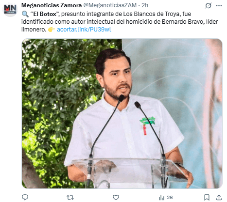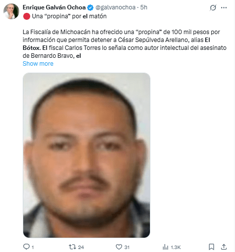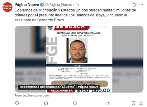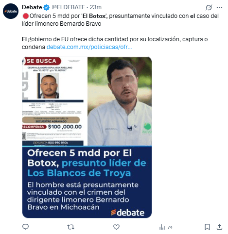 Regeneración, 29 de octubre 2025– Gobiernos de Michoacán y EE.U. informaron que pusieron precio a la cabeza de César Sepúlveda, ‘El Bótox’, presunto autor intelectual del asesinato del dirigente limonero Bernardo Bravo hace una semana en Apatzingán.